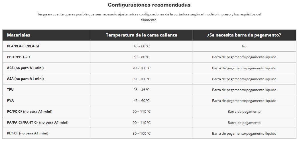 - Ajusta la temperatura de la cama según las especificaciones del filamento.