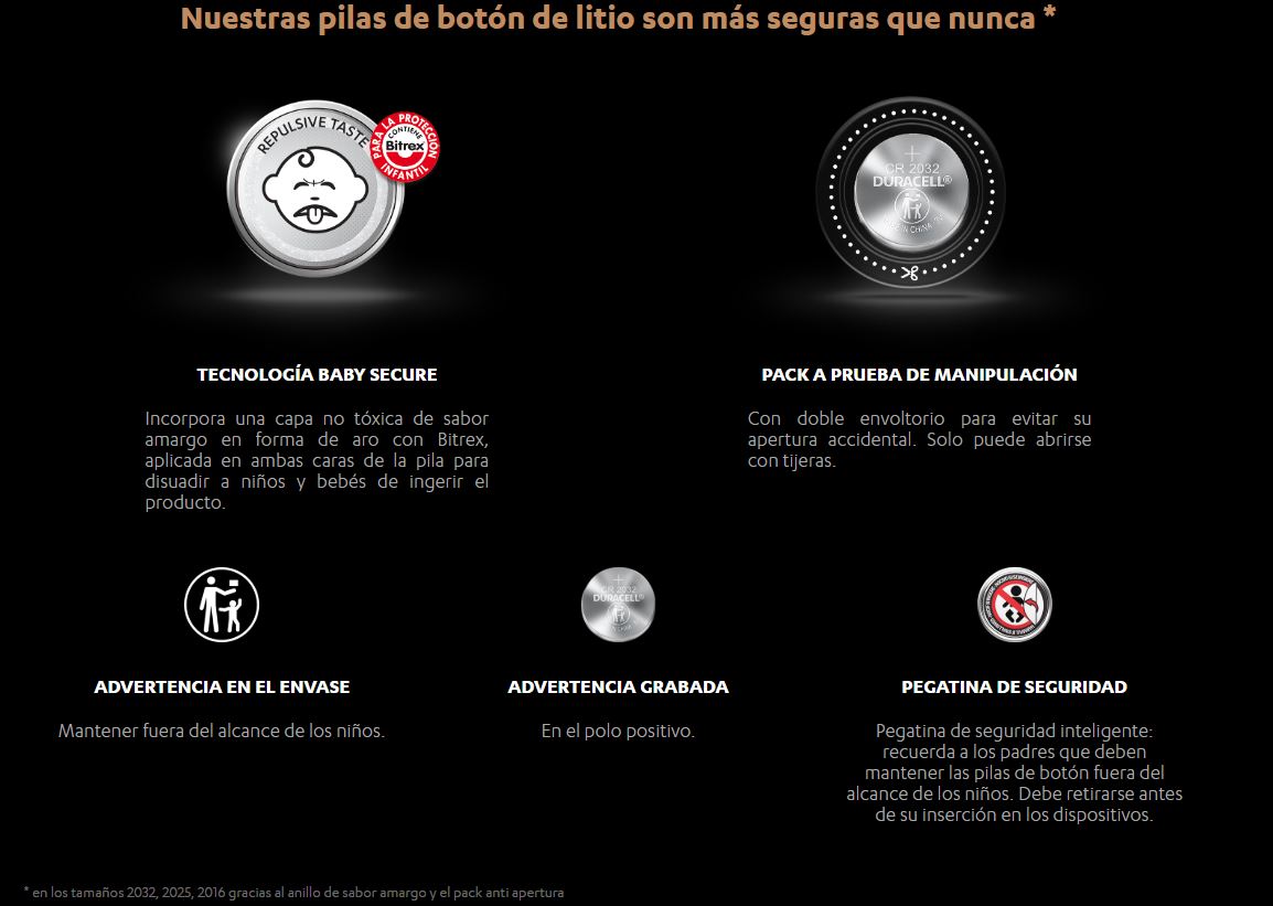 Esta pila incorpora una capa en forma de anillo con sabor amargo, elaborada con Bitrex®, para ayudar a disuadir a bebés y niños pequeños de llevársela a la boca o tragarla. Además, el envase ha sido diseñado para ofrecer una mayor protección frente a manipulaciones accidentales.