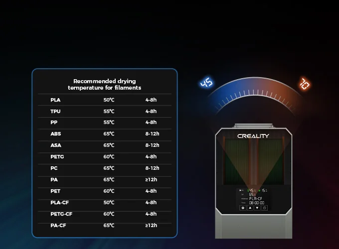 Los filamentos húmedos pueden causar problemas como exceso de hilos, obstrucciones, mala adherencia y desplazamiento de capas, especialmente en impresiones a alta velocidad. El Creality Box Space Pi Plus seca tus filamentos durante el proceso de impresión, mejorando la calidad del modelo 3D y reduciendo la influencia de factores ambientales externos.