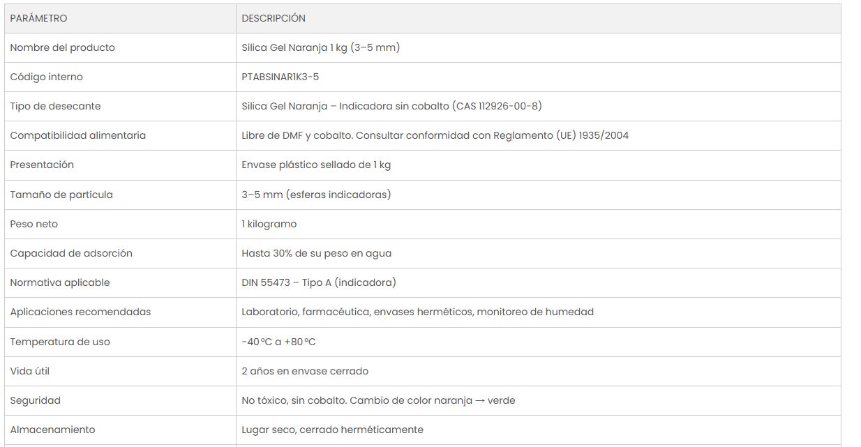 La sílica gel naranja 3–5 mm en bolsa de 1 kg es una solución eficaz y segura para el control de humedad en aplicaciones técnicas, industriales, logísticas, farmacéuticas y electrónicas. Su formulación sin cobalto y su tecnología PEM-HI garantizan un alto rendimiento, máxima seguridad y una supervisión visual rápida del nivel de saturación.