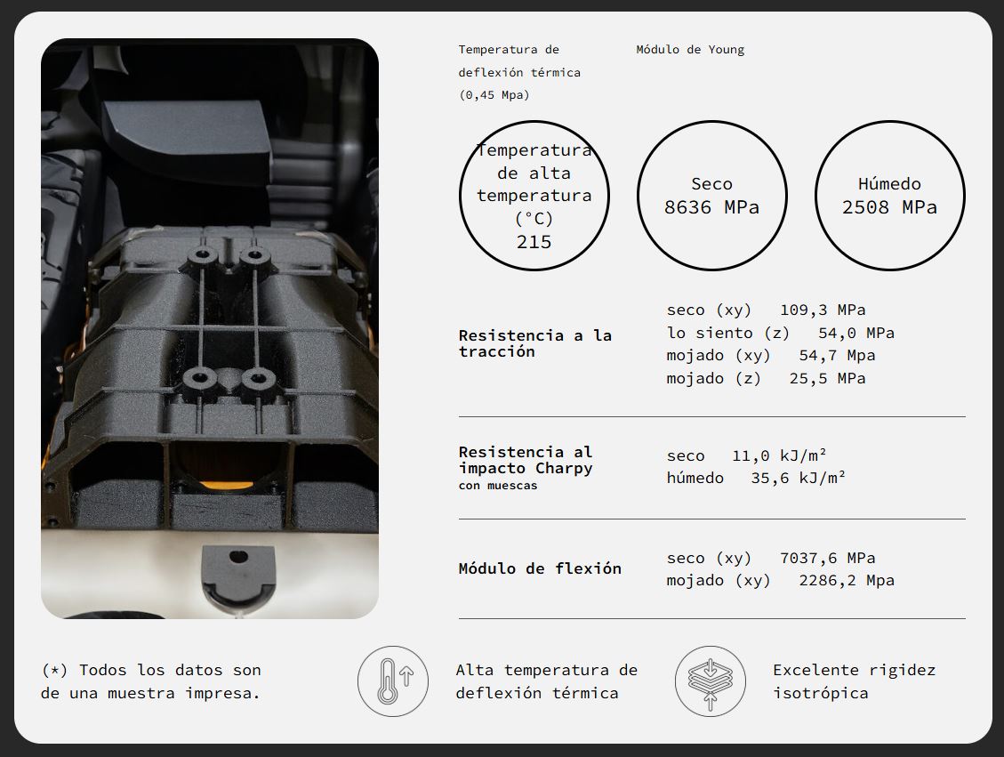 Ideal para impresión de piezas técnicas sometidas a carga y temperatura