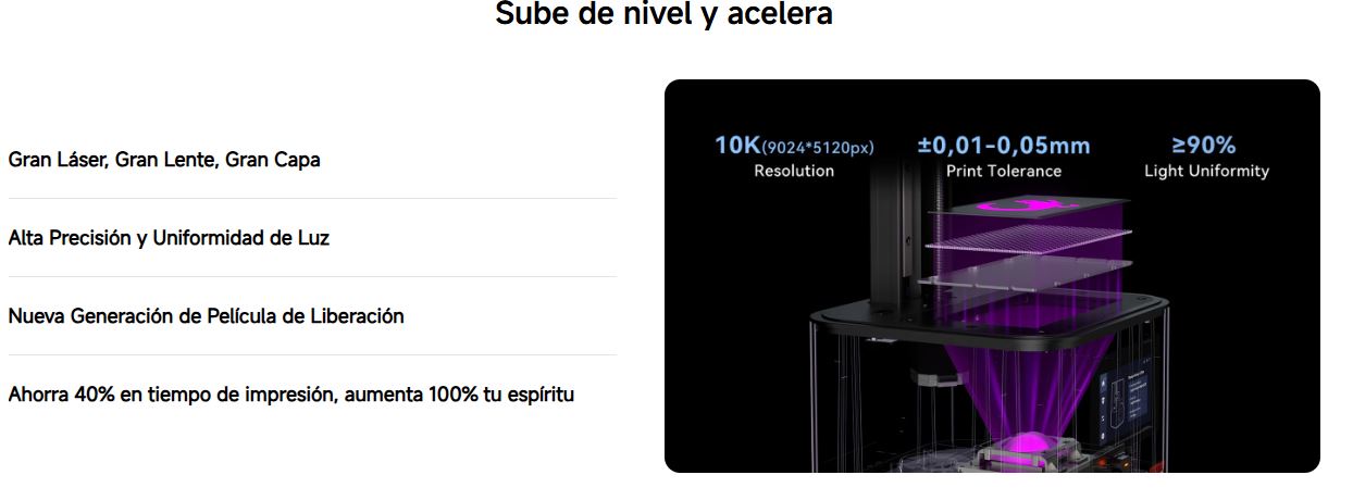 Equipada con una pantalla monocromática 10K de 7 pulgadas, esta impresora permite obtener superficies extremadamente finas y detalles muy definidos, siendo perfecta para aplicaciones donde la precisión es clave. Su sistema de iluminación COB con lente Fresnel garantiza una distribución uniforme de la luz, mejorando la calidad de impresión y la consistencia entre piezas.
