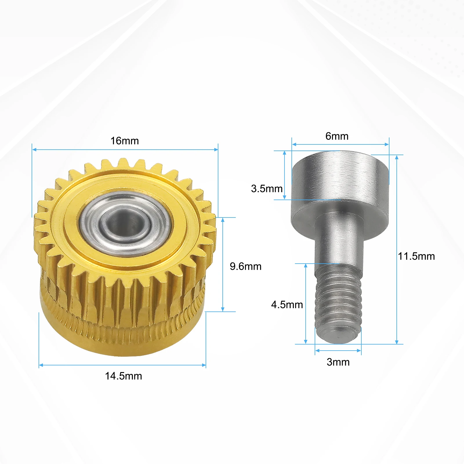 Kit de engranajes de extrusora mejorado diseñado para optimizar el arrastre del filamento y mejorar la estabilidad en la impresión 3D. Fabricado en acero endurecido con tratamiento niquelado y recubrimiento DLC, ofrece alta resistencia al desgaste y protección frente a la corrosión.