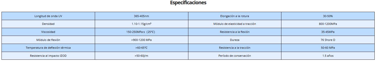 Ps: Las propiedades del material variarán en función del equipo de moldeo, el método de postcurado y el equipo de pruebas. Para más información sobre seguridad, consulte la hoja de datos de seguridad del producto.